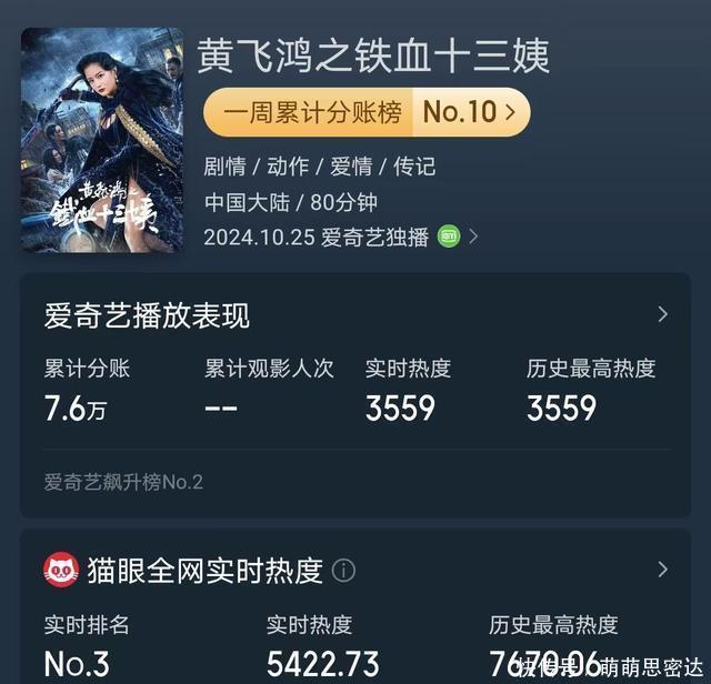 而与它们同日运转在国内线上视频平台播出的一部四肢爱情片《黄飞鸿之铁血十三姨》,第一天的分账票房成绩相同也莫得达到10万东谈主民币。 《黄飞鸿之铁血十三姨》是国内首部以十三姨这个变装为第一主角的“黄飞鸿”电影,该片是由刘巴音和唐亚杰蚁合主演,南笙和杜宇航蚁合主演。它主要申报了黄飞鸿不测失散以后,十三姨履历重重阻险,通过我方的奢睿和刚毅相识与洋东谈主斗智斗勇的故事。 电影中,南笙演出的等于第一主角十三姨,杜宇航塑造的则是黄飞鸿。