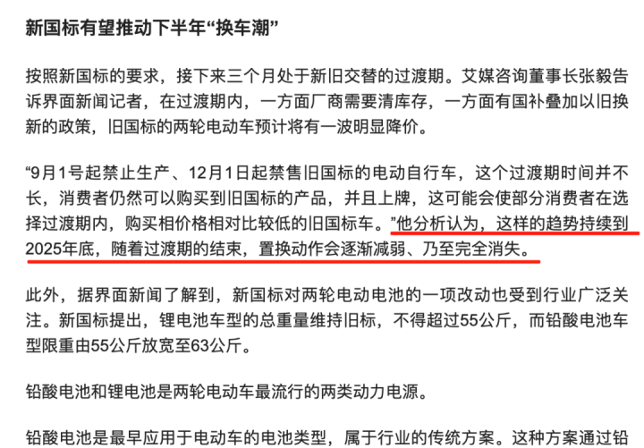 另外,电动车新国标仍是本质,旧国标车9月1日起不容坐蓐,而销售则有3个月过渡期,用于给商场清库存。