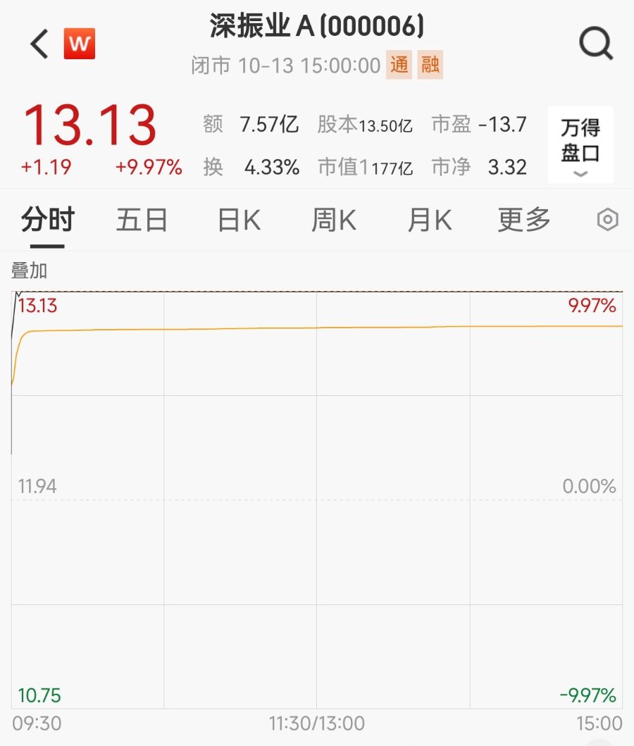 10月13日,新凯来意见股逆势活跃,新莱应材、凯好意思特气等个股两连板,同惠电子30CM涨停,奥普光电10CM涨停。值得提神的是,深圳国资地产龙头深振业A(000006.SZ)也看成新凯来意见股获10CM涨停,录得两连板,章程收盘报13.13元/股,市值177亿元。