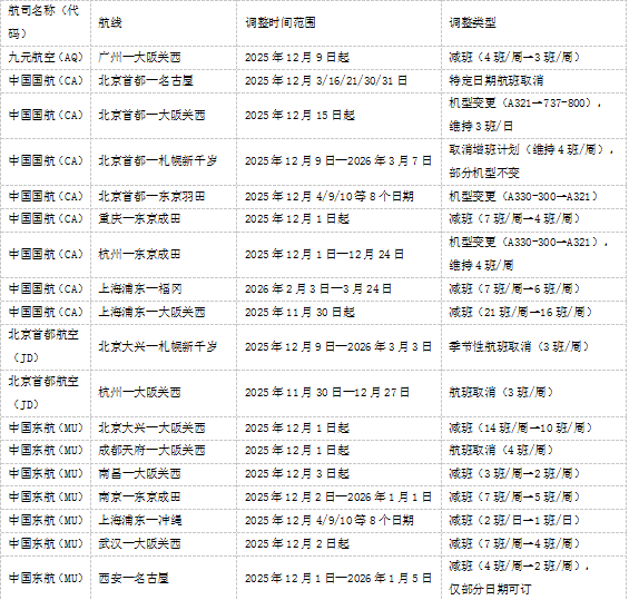 从12月1日起中国航司原定的中日航班将来数月将面对较大边界的减班和取消,时候跨度障翳元旦和春节,直至2026年3月底。