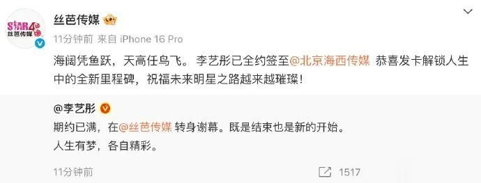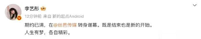 12月23日零点体育游戏app平台,@李艺彤 寿辰发文臣宣离开丝芭,“期约已满,在@丝芭传媒 回身谢幕。既是领域亦然新的运转。”随后,丝芭转发祝贺,“海阔凭鱼跃,天高任鸟飞。”