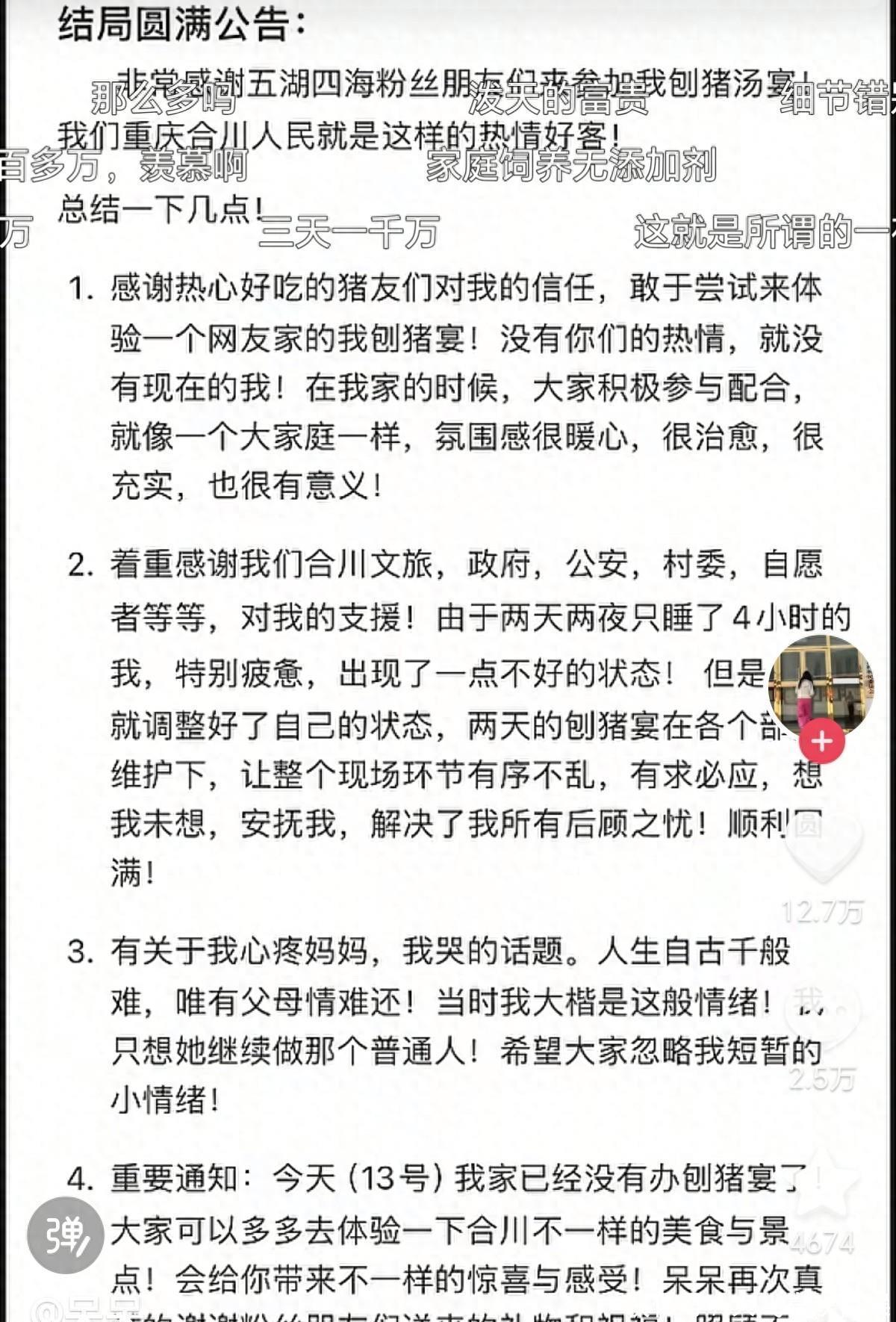 合川吵杂的杀猪饭边界了,东说念主们余味无穷,带着不舍离开了呆呆家。这场络续了三天的杀猪狂欢会,不单是为呆呆带去了欢喜,窘迫,同期也为呆呆带来了巨大的东说念主身金钱。