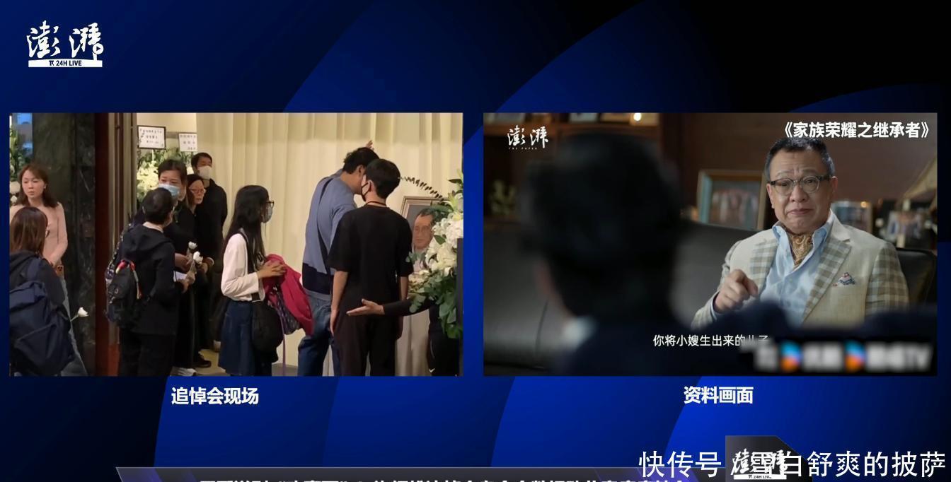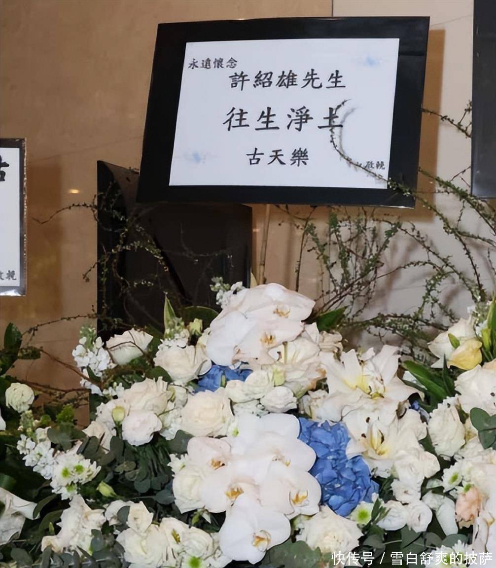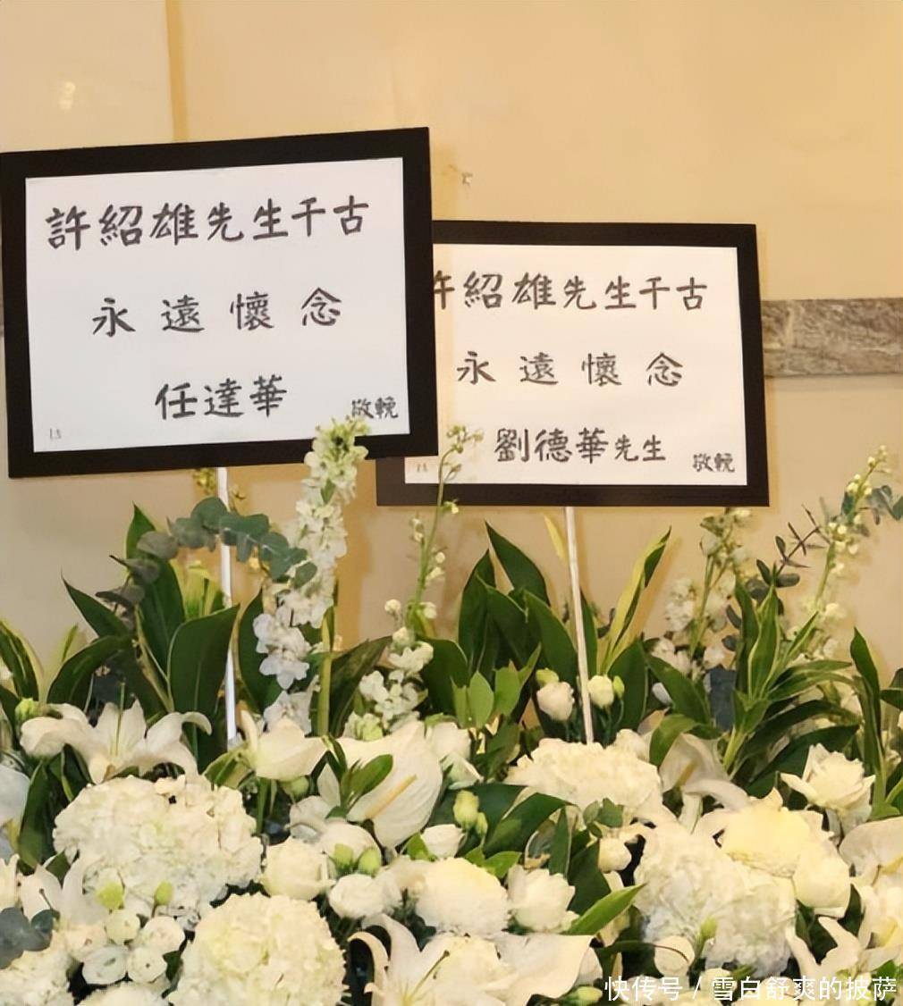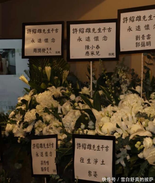 总之,许绍雄的灵堂充满了氛围感,他那张经典的相片被用作遗照,四周围满了白色鲜花,遗照上方挂有四个大字“长期怀念”,下方摆放着一个宏大的香炉和烛炬,圈内好友们的花圈被摆放在两侧,高档又肃肃。