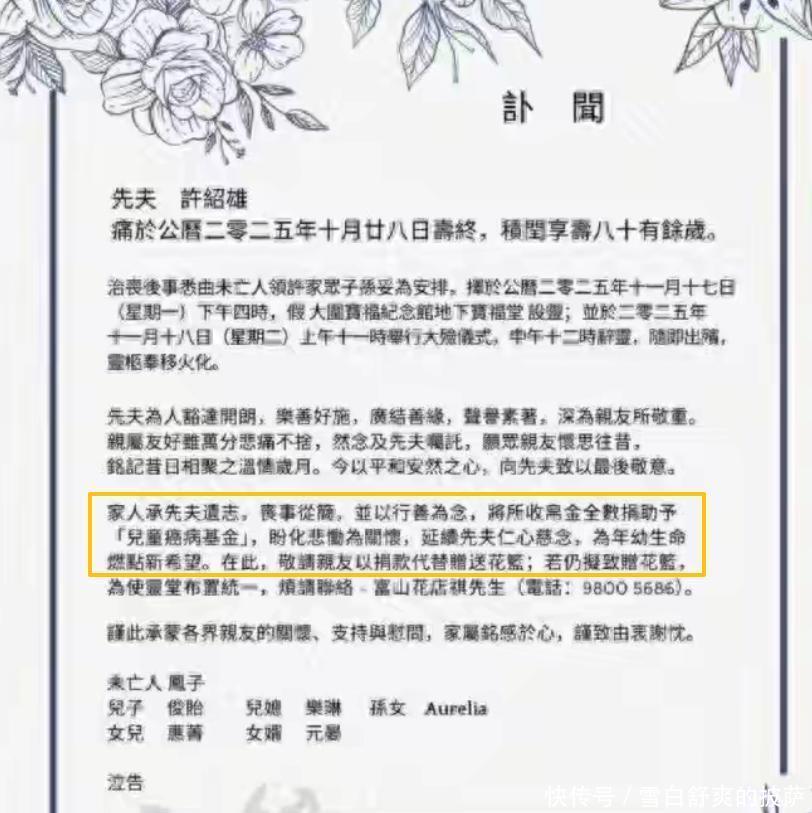 其实家属发布的讣告中就有写到,凭证许绍雄遗愿凶事勤俭,况兼要将通盘的帛金全部捐助给“儿童癌症基金”,是以讣告中但愿亲一又们不要送花篮,而是把花篮钱该为捐钱代替。