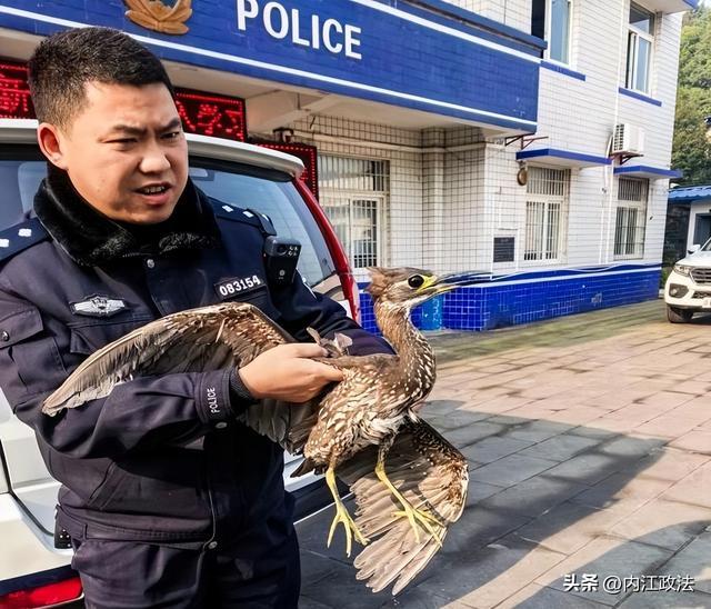 接警后,威远县公安局新场派出所民警辅警马上前去现场。经堤防斡旋不雅察,发现该鸟羽毛呈黯澹的棕褐色、黑褐色,身上伴有血印,左侧翅膀明显下垂,屡次拒抗仍无法升起,状况软弱。