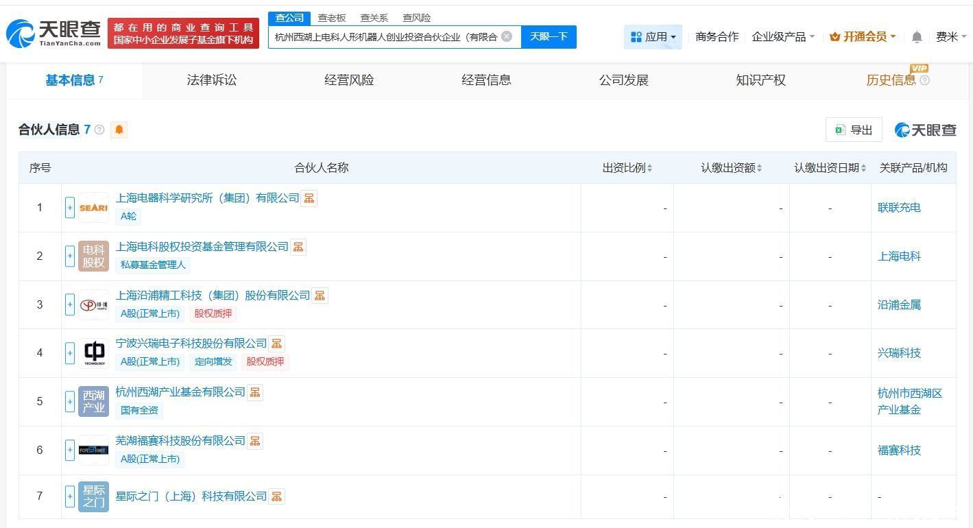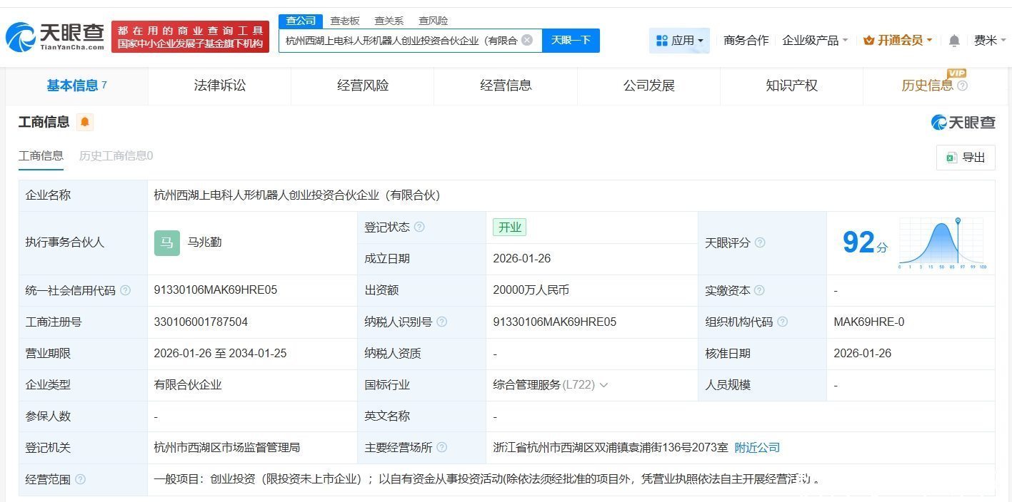 天眼查App流露体育游戏app平台,近日,杭州西湖上电科东说念主形机器东说念主创业投资合股企业(有限合股)建树,践诺事务合推动说念主为马兆勤,出资额2亿东说念主民币,盘算界限为创业投资、以自有资金从事投资作为,由上海电器科学磋议所(集团)有限公司、上海沿浦(605128)、兴瑞科技(002937)、福赛科技(301529)等共同出资。