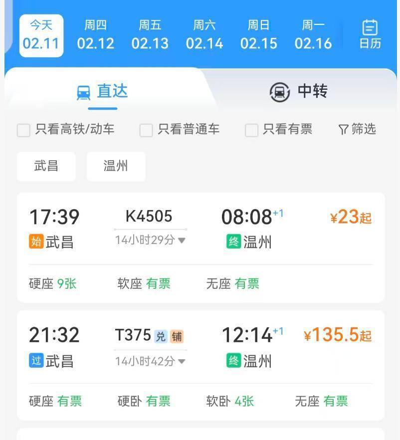 武昌至浙江温州仅需23元、河南信阳至广东深圳仅需42.5元……极目新闻记者把稳到,春运本事,不少非热点澄澈开启了大幅打折优惠,推出广阔2折、3折的火车票。