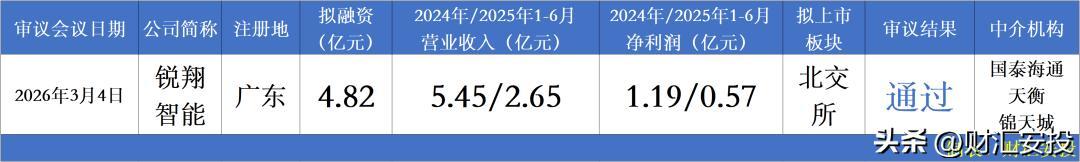 3月4日,北交所公告,上市委员会2026年第18次审议会议于2026年3月4日上昼召开,审议成果珠海锐翔智能科技股份有限公司得当刊行要求、上市要求和信息泄露要求。