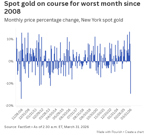 现货金价本月瞻望下降 14.6%,将是 2008 年以来最大单月跌幅。