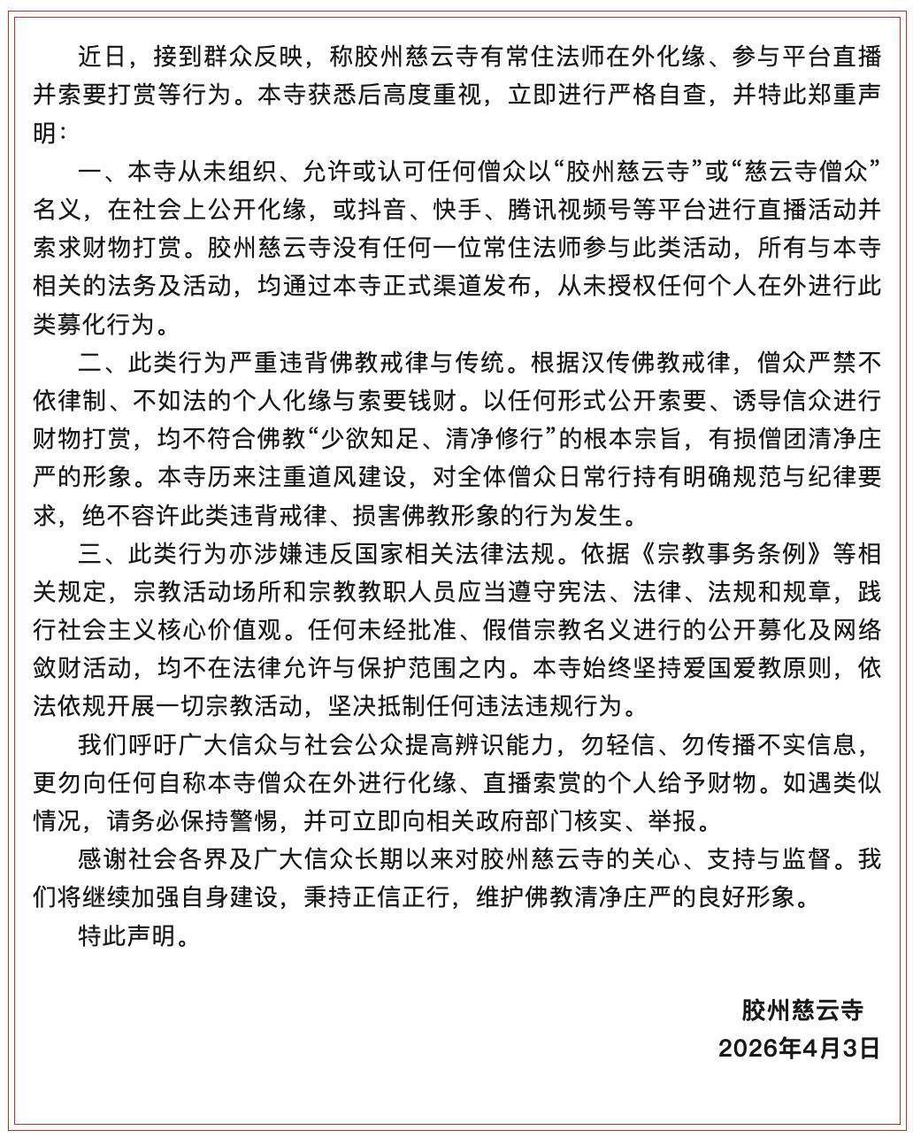 胶州慈云寺在公开声明中暗示,本寺从未组织、允许或招供任何僧众以“胶州慈云寺”或“慈云寺僧众”模式,在社会上公开化缘,或抖音、快手、腾讯视频号等平台进行直播算作并索求财物打赏。胶州慈云寺莫得任何一位常住法师参与此类算作,通盘与本寺相干的法务及算作,均通过本寺崇拜渠谈发布,从未授权任何个东谈主在外进行此类募化步履。